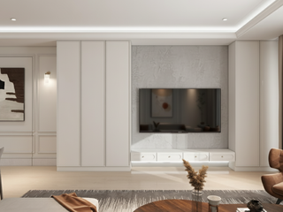 公領域以奶油白×淺木為基底,溫柔又百搭。客廳的弧形沙發像極了她忙碌一天後的避風港,搭配木質圓桌與暖棕抱 枕,不小心就會變成小孩的遊戲基地。電視牆以線板、石紋與隱藏收納結合視覺美感,讓生活雜物有地方藏、心情也能跟著清爽。