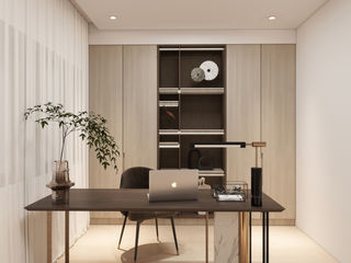 餐廳旁的大面展示櫃與黑框玻璃門,是家裡的「時尚背景牆」,同時讓她在用餐、工作之間自由切換。書房以大量溫潤木質與柔光打造安靜角落,像是替她準備的「專注工作場」。主臥軟裝選擇米白、灰與霧金細節,溫柔卻有力量,正如她本人。